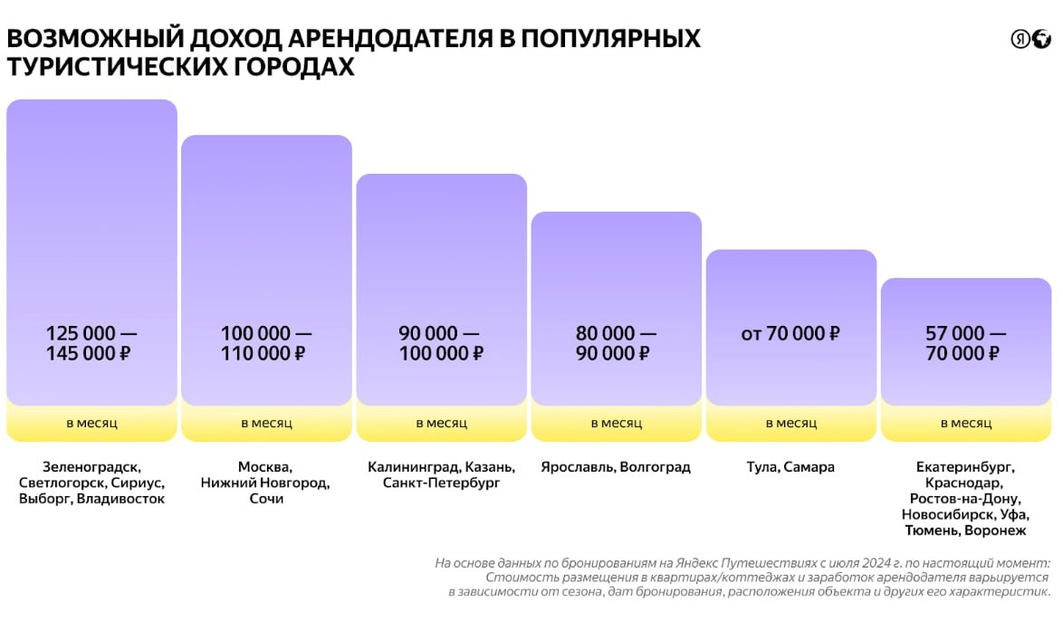 🏠Яндекс Путешествия сообщают, что средний чек за посуточную аренду апартаментов на платформе составляет 4 800 рублей Коллеги также оценили усредненный возможный доход: ✅до 125–145 тыс. рублей — в популярных небольших городах вроде Зеленоградска или Выборга; ✅до 100–110 тыс. рублей — в крупных городах вроде Москвы, СПб, Казани, Сочи. Конечно, с оговоркой, что заработок зависит от сезона, расположения, дат бронирования и других условий. Кстати, с недавних пор подключиться к платформе посуточникам стало проще: теперь из любого региона РФ это можно сделать напрямую в Экстранете, без обязательного участия технических партнеров, как это было раньше. Доступ открыли для всех — физлиц, самозанятых, ИП и юрлиц. Если вы еще не работаете с сервисом, рекомендую обратить внимание. Мы сами его используем с тех пор, когда зарегистрироваться можно было только через channel manager)).