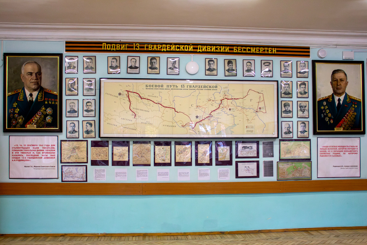 Путь 13-й Гвардейской дивизии, которому и посвящены стенды музея, удивительным образом совпадает с самыми значимыми вехами Великой отечественной войны. Солдаты этой дивизии участвовали в знаковых битвах, ставших коренными переломными моментами в ходе всей Второй мировой войны! В соответствии с хронологией событий музей был разделен на две части – начало войны, затем переход – Сталинградская битва и зал Победы – от Курской дуги до освобождения Праги! И этот второй зал был полностью моим, я вела повествование об этих событиях. Именно здесь я рассказывала о танковом сражении, форсировании Днепра, марш-броске на танках маршала Рыбалко, позволившему спасти заминированный европейский город…