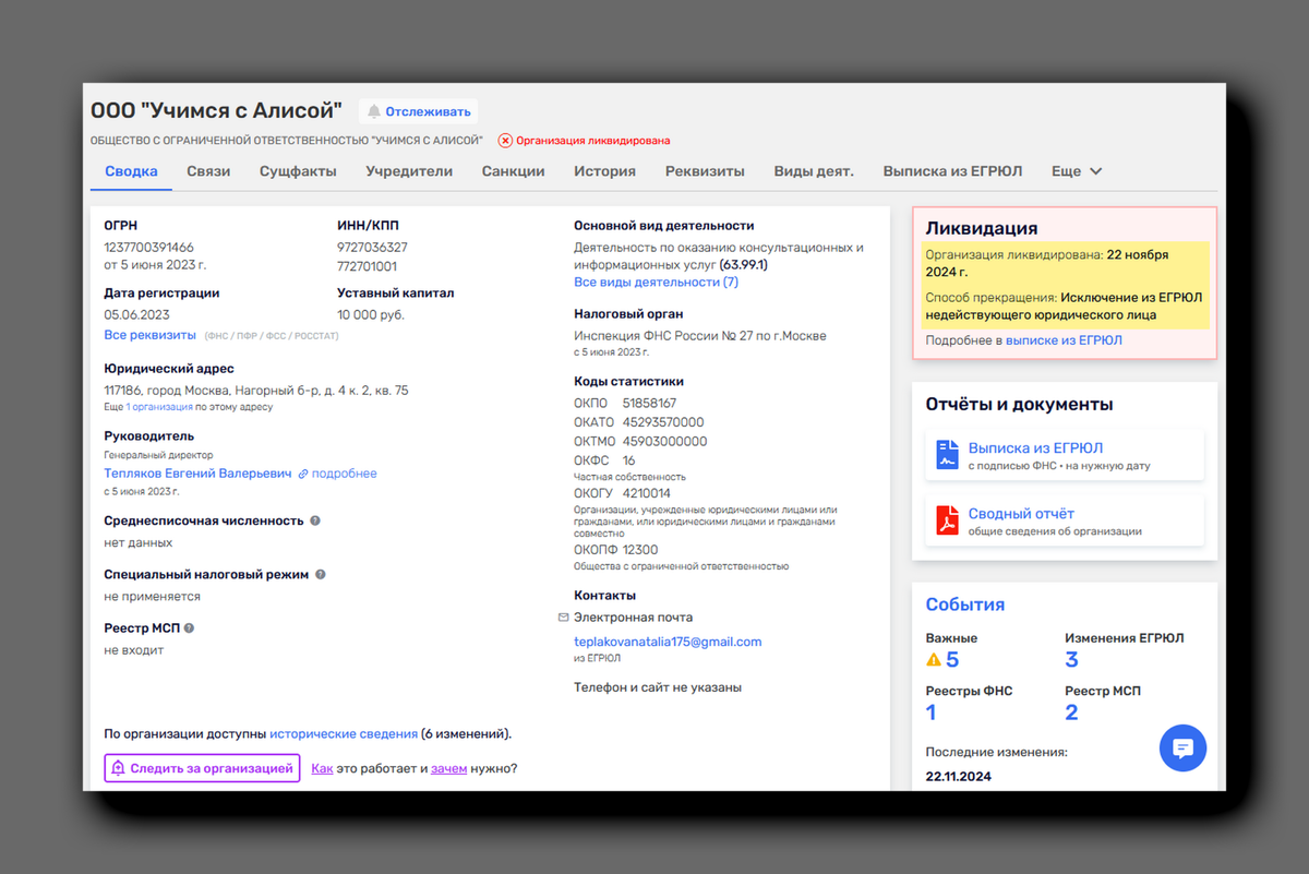 Сокращения - это отдельное искусство, где каждая буква не столько несёт смысл, сколько создает иллюзию значимости. Многие организации, учреждения, компании или фирмы, едва подписав устав, спешат обзавестись аббревиатурой для солидности. Ведь одно дело - «Общество с ограниченной ответственностью “Учимся с Алисой”», и совсем другое - ООО ООО «Учимся с Алисой». Тут сразу чувствуешь деловую мощь, перспективы и почти космический масштаб! Напомню, в 2023-м, преодолевая непреодолимое препятствие на пути к заветному «красному диплому» для Алисы, и испробовав все мыслимые способы получить справку о прохождении практики, Тепляков нашёл «гениальное решение». Два года назад «истинный коммунист» зарегистрировал коммерческую организацию, предназначенную для оказания консультационных и информационных услуг. Консультационные услуги - тут всё понятно. Предполагалось, что Алиса Евгеньевна будет официально консультировать всех желающих пообщаться с самым знаменитым специалистом в области «психологических