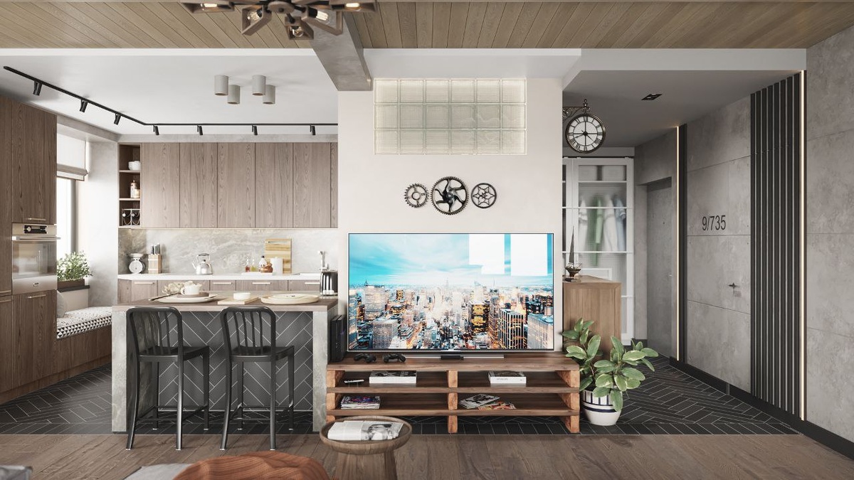 Открытое пространство. Планировочным решением стало объединение всех зон, кроме приватных, в одно открытое пространство. Но при этом кухонная зона скрыта со стороны входной группы. Зонированием послужил гостевой санузел, находящийся за ТВ-зоной, который отделил входную зону от кухонной. Находясь в гостиной можно увидеть все пространство целиком, что способствует беспрепятственному общению и передвижению в этом пространстве. Проект - #АЧ_ЛОФТ_эволюция
