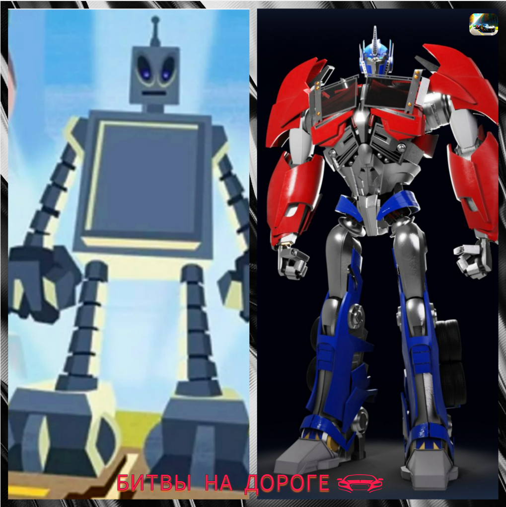 Для начала определимся с размерами. Точных цифр в мультфильме про супер робота нет. Визуально рост не меньше 70 метров. В битве с егерем мы выявили, что он немного уступает ему, потому примем 70. Вес тоже неизвестен. По комплекции он немного "неравномерно" развит. Аккуратная, квадратная голова, огромные глаза (видимо решение художников), гибкие конечности в виде тросов или трубопроводов, массивные ноги-платформеры, кулаки соответствующие. Любой элемент его тела может функционировать отдельно. Каждая из обезьянок берёт под управление свою часть тела. Командиру команды достался самая крупная часть - корпус. Потому потеря этой части наиболее фатально. Рост трансформера лишь 10 метров в лучшем случаи. Оптимус имеет более "пропорциональное" строение тела, приближенное к человеку. Плечи более широкие, ноги заметно длиннее корпуса, голова по сравнению с телом очень маленькая. Сам робот может трансформироваться в большую технику. Одна из самых знаковых и популярных альтер-форм - американский тягач марки Peterbuilt или Kenworth. В нашей версии его новая форма - экспериментальный вездеход. С ним он смотрится ещё более массивно, прочнее. В режиме грузовика он может разгоняться до 400 км/ч. На своих двоих он догонял поезд, но быстрее 130-140 км/ч, вряд ли, бежит. В режиме робота он манёвренный, быстро реагирует на атаки, но в сравнении с соперниками его размеров и крупнее. Более мелкие, юркие уже превосходят его. Как грузовик ему уже тяжелее уворачиваться, потому, часто, приходится рассчитывать на свою высокую прочность. Супер робот команды может летать, при том полёты масштабного характера. Можно было бы посчитать это за победу, только наш Оптимус, тоже, может летать. Что довольно редко бывает. Чисто теоретически, большой робот может летать быстрее, но это никак не доказать, потому примем их показатели за равные.