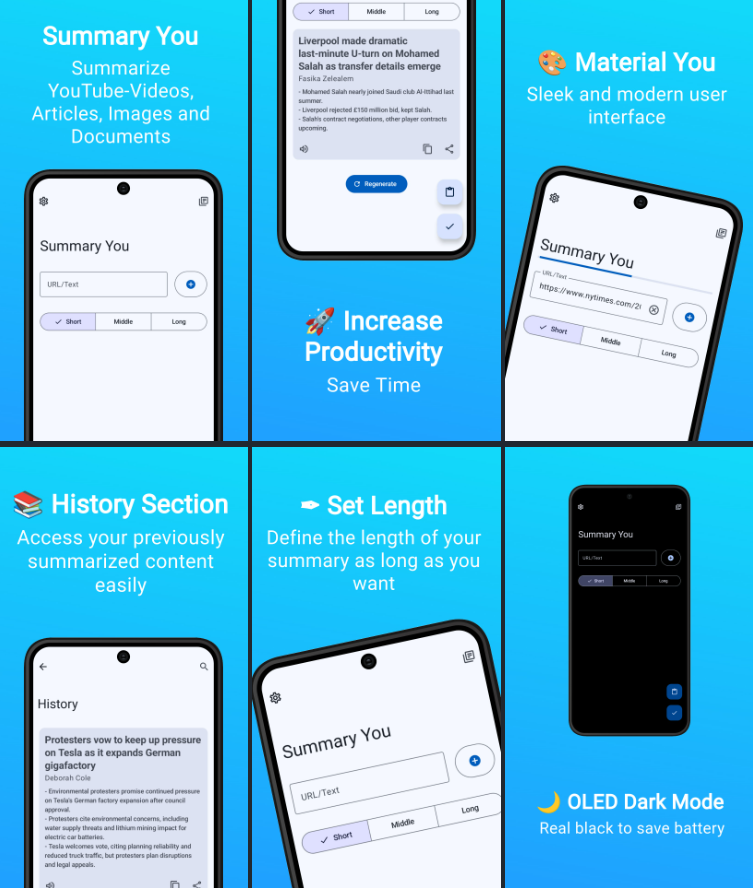 SummaryYou — это Android-приложение, которое позволяет создавать краткие изложения различных материалов, включая YouTube-видео, статьи, изображения и документы, с использованием технологий ИИ. * Настройка длины резюме: Позволяет настраивать длину резюме в зависимости от ваших предпочтений, от кратких обзоров до подробных сведений. * Голосовое чтение: Функция голосового воспроизведения позволяет прослушивать резюме, что удобно при отсутствии возможности читать. * История запросов: Легкий доступ к ранее созданным резюме в разделе "История", что позволяет повторно использовать ранее полученные данные без необходимости их повторного создания. * Интеллектуальное выявление платных ограничений: Приложение автоматически определяет и учитывает платные ограничения на контент, обеспечивая корректную обработку материалов. * Поддержка различных форматов: Возможность обрабатывать различные типы контента, включая текстовые статьи, изображения и документы, расширяя функциональность приложения. * Удобс