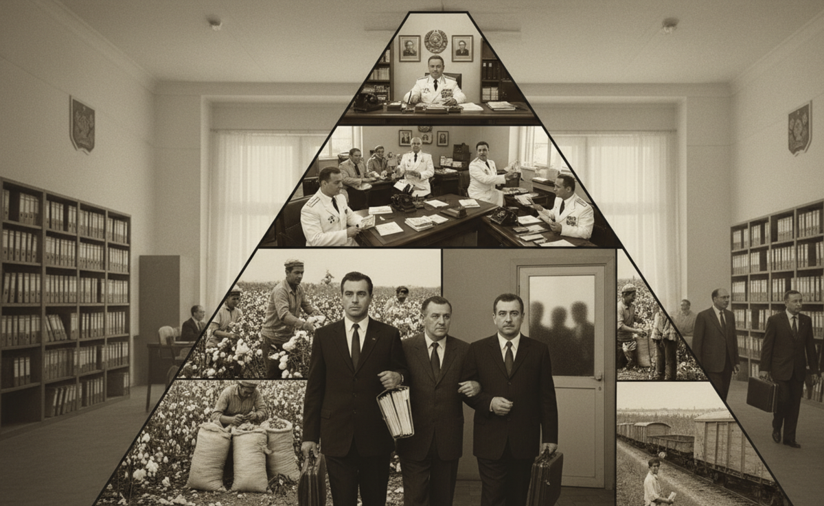 Вся система держалась на том, что взятки шли снизу вверх по вертикали власти. Бригадир получал от директора совхоза 500 рублей, чтобы приписать 10 тонн хлопка. Директор совхоза платил секретарю райкома 5 тысяч рублей, чтобы тот закрыл глаза на махинации. Секретарь райкома отдавал секретарю обкома 50 тысяч рублей за политическое прикрытие. Секретарь обкома передавал в республиканский ЦК 200 тысяч рублей, а оттуда часть денег уходила в Москву — чиновникам министерств, депутатам, родственникам первых лиц государства.