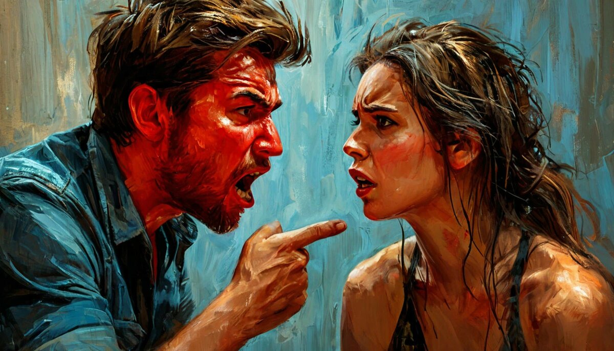 На что муж, не ответив ни на один вопрос, бьет кулаком по столу и предлагает жене заткнуться. Фитиль догорел, бомба взорвалась, и понеслось:
