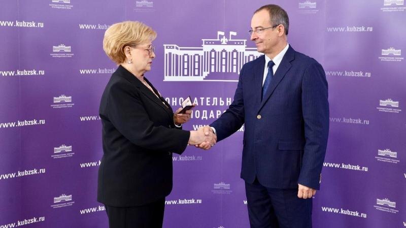 Спикер ЗСК поздравил Веру Галушко с избранием в состав гордумы VIII созыва и на пост председателя, а также вручил удостоверение заместителя председателя Совета законодателей Краснодарского края.