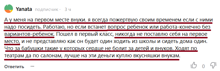 Волна комментариев была предсказуемой: «эгоистка», «внуки должны быть на первом месте», «вы не любите свою внучку», и мой любимый аргумент — «вот потом и сдадут тебя в дом престарелых».