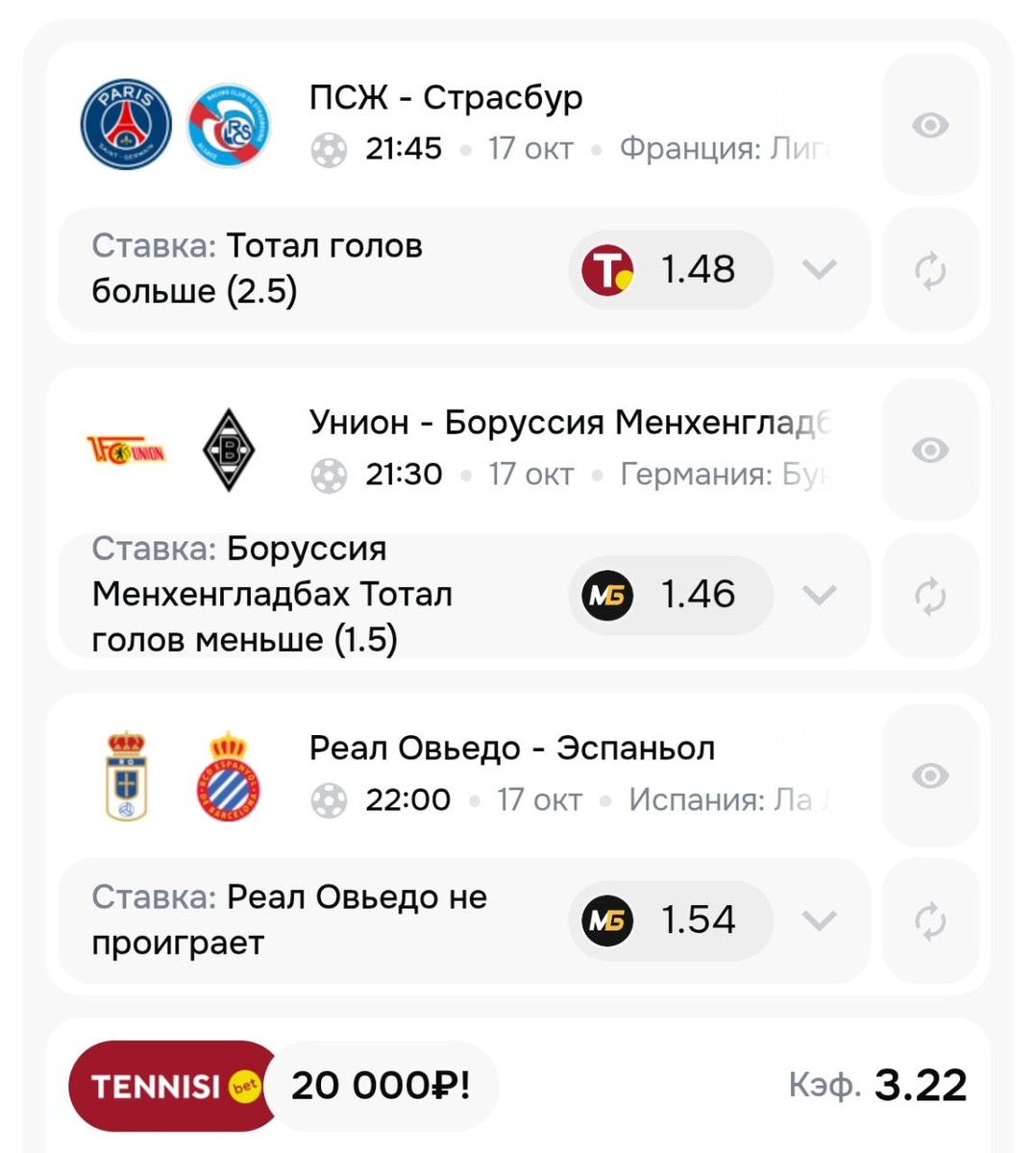Разберём теперь футбольный экспресс на сегодняшние матчи в топ-лигах Европы 👇 ✅ ПСЖ-Страсбур Ставка: Тотал больше 2.5 голов ТБ 2.5 голов сыграл в 9 из 10 последних очных матчей этих команд в чемпионате Франции ✅ Унион-Боруссия Мёнхенгладбах Ставка: Боруссия Мёнхенгладбах, ТМ 1.5 гола Боруссия Менхенгладбах забивает меньше 1.5 мячей в 9 из 10 последних очных встреч этих команд в Бундеслиге ✅ Овьедо-Эспаньол Ставка: 1Х Эспаньол не выигрывает на выезде в 7 матчах подряд в Ла Лиге Забери фрибет 🔝