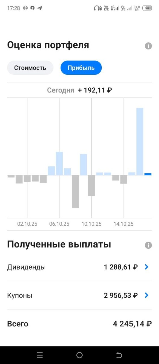 На рынке небольшое оживление сегодня😊 по графикам видно, что самый лучший день для покупки был 14.10, сейчас прям заметно все подросло, но надолго ли - неизвестно🙃. Золото превысило доходность 100% в моем портфеле. Даже замещайки подросли. У Кирилла в портфеле +16253 рубля доходности за 8 месяцев, учитывая что портфель ежемесячно пополняется, а на рынке то боковик, то падение, очень даже неплохо. А вы как считаете? Что у вас с доходностью?