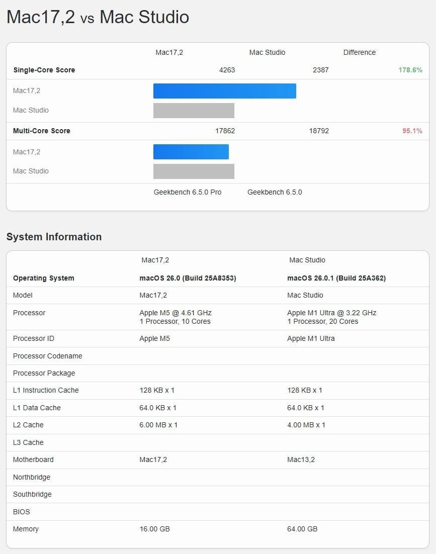 Apple M5, установленный в последних MacBook Pro и iPad Pro, практически не уступает M1 Ultra в многоядерной производительности при вдвое меньшем числе ядер и заметно обходит его в одноядерных тестах Geekbench 6. В одноядерном тесте M5 набирает (https://browser.geekbench.com/v6/cpu/compare/14496729?baseline=14493745) 4263 балла — на 78,6% больше, чем у M1 Ultra (2387), а в многоядерном 17 862 балла, всего на 4,9% меньше результата M1 Ultra (18 792). @techogid