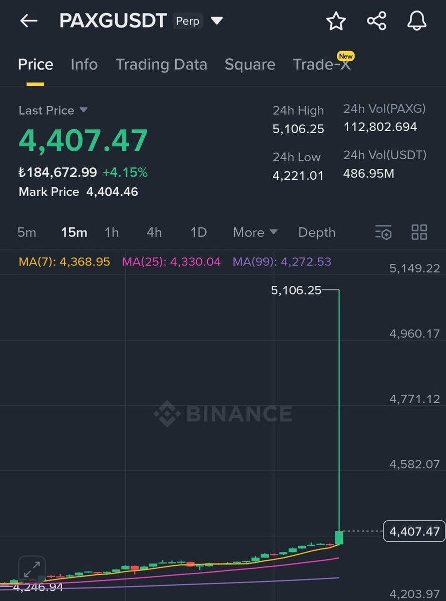 PAXG (токеннезированное золото) на Binance взлетело до $5106, ликвидируя короткие позиции.