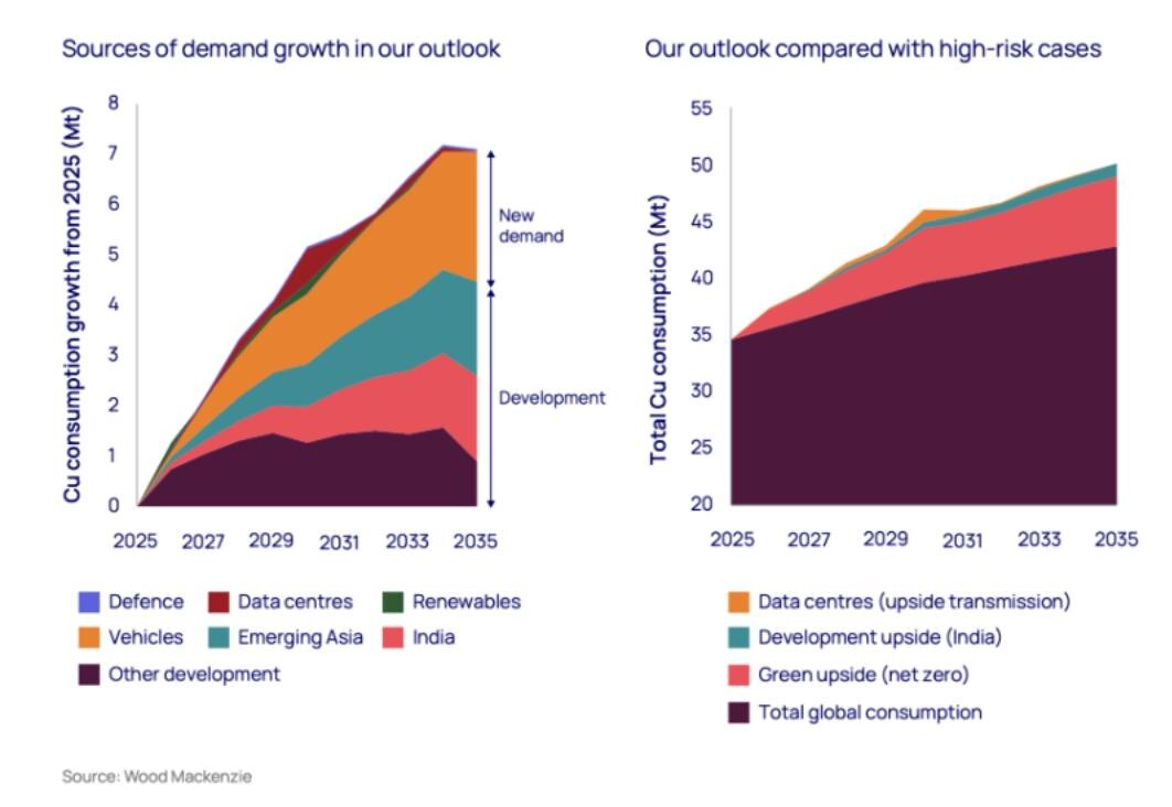 Мировой спрос на медь вырастет на 24% к 2035 году, увеличившись на 8,2 млн тонн в год до 42,7 млн т/год, согласно новому отчету Horizons от Wood Mackenzie К 2035 году искусственный интеллект будет потреблять дополнительно 2200 ТВт·ч электроэнергии. Это приведет к увеличению спроса на медь только для сетевой инфраструктуры до 1,1 млн тонн в год к 2030 году. Помимо спроса, обусловленного ИИ, энергетический переход фундаментально меняет модели потребления меди. Переход на возобновляемые источники энергии потребует дополнительных поставок меди на два миллиона тонн в год в течение следующего десятилетия. По прогнозам, спрос на медь в этом секторе вырастет с 1,7 миллиона тонн в год сегодня до 4,3 миллиона тонн в год к 2035 году Для удовлетворения растущего спроса к 2035 году потребуется более восьми миллионов тонн новых шахтных мощностей и 3,5 миллиона тонн "дополнительного лома" в год.