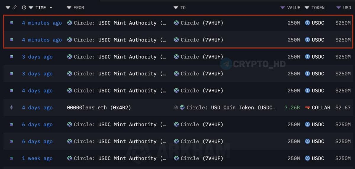 🖨 Arkham: В Circle напечатали 500,000,000 #USDC