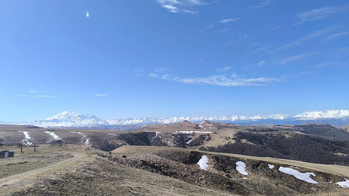 Подъём на 2144 метра чувствуется, набор высоты идёт довольно быстро. А со смотровой площадки открывается вид на Эльбрус с непривычной стороны.