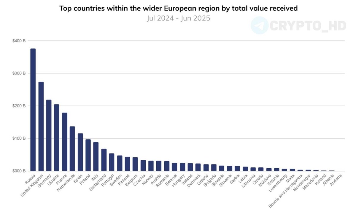 🇷🇺 Россия – лидер Европы по крипто-адаптации. Согласно свежему отчету Chainalysis, за год в Россию поступили криптоактивы на $376,300,000,000 – почти на 50 % больше, чем годом ранее. Для сравнения: Великобритания – $273,000,000,000. ✦ Рост крупных переводов ($10,000,000+) – +86% за год. ✦ DeFi-активность выросла в 8 раз. ✦ Розничный сектор растет быстрее, чем во всей остальной Европе. Аналитики связывают этот скачок с переходом к криптовалютным финансовым сервисам – от DeFi-платформ до стейблкоинов, обеспеченных рублем. В итоге Россия обошла все европейские страны по объемам криптовалютных операций и, по сути, сформировала собственный ончейн-финансовый контур. Ранее: - регуляция крипты - BTC в обзоре ЦБ РФ - доступ для неквалов Crypto Headlines