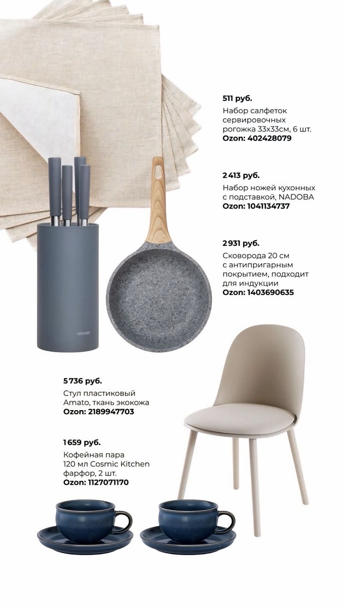 Современная кухня — это не только техника и фасады. Настроение создают фактуры, мягкие формы, продуманные мелочи: от салфетки под тарелкой до изгиба смесителя. Я собрала для вас восемнадцать вещей с озон, которые легко собрать в единую, спокойную и очень уютную картину. Идём строго по артикулам — у каждой позиции подробное описание и совет стилиста.