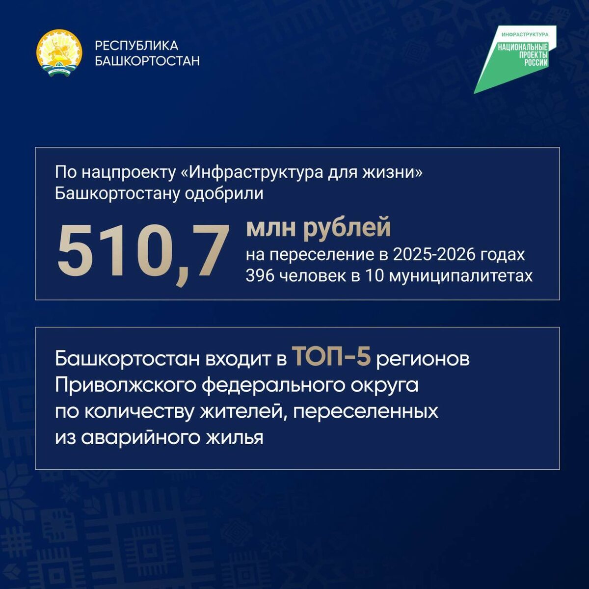 Это позволит в ближайший год переселить почти 400 человек в 10 муниципалитетах республики. Более полумиллиарда рублей получит Башкортостан на новый этап программы по расселению аварийного жилья в рамках нацпроекта «Инфраструктура для жизни». Это позволит в ближайший год переселить почти 400 человек в 10 муниципалитетах республики, сообщил в своих соцсетях Радий Хабиров. До 2030 года планируется расселить 568 многоквартирных аварийных домов общей площадью 217 тысяч квадратных метров, отметил глава Башкирии. Решать этот вопрос помогает, в том числе федеральная программа комплексного развития территорий, в рамках которой развиваются перспективные площадки Забелья и Зауфимья.