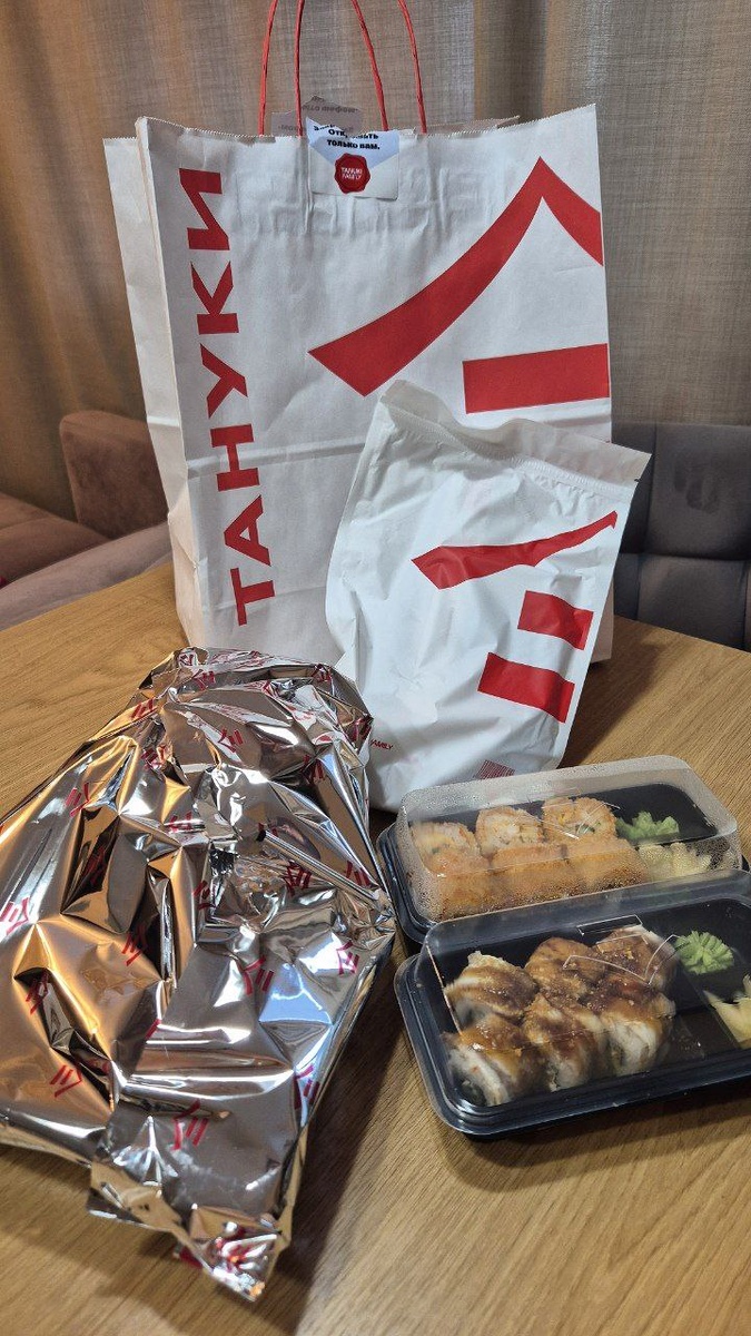 Обзор на доставку из Тануки 1. Ролл Орандж Микс - 540 р Состав: эквадорская креветка, жареный лосось, хрустящие огурцы, омлет, водоросли маменори, спайси соус, 6 шт. 👍Панировка тонкая, ролл большой на 2 укуса 😁На сайте конечно, ну очень красивая картинка, идеально ровно завернутые. 2. Ролл Даку с угрём - 550р. Состав: жареный угорь, хрустящий огурец, авокадо, сливочный сыр, соусы спайси и унаги, тобико, цитрусовый кунжут, 6 шт. 3. Лапша Пай Дай с курицей - 590 р В составе и курица и креветки, немного острая, обратите внимание. 4. Говядина умисай - 590 р. Нежная говядина, дайкон, овощи, чили, свежая зелень, рис, чеснок, маринованный тофу, ростки сои, авторский соус Мы с мужем гадали, что лежит на рисе, сейчас посмотрев состав поняла, что это был тофу. ✔️Доставка быстрая, до Демы стоила 169 рублей. Привезли в указанный на сайте промежуток времени. ✔️Очень хорошо всё упаковано 🔥А теперь самое вкусное - скидки 😁 Общий счёт вышел 2499 р - промокод 20% на первый заказ - скидк