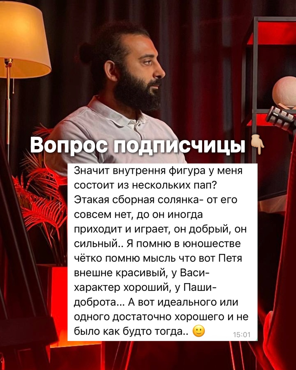 Смотрите, здесь есть одна очень важная вещь, которую нужно понять — прежде чем вообще пытаться отвечать на вопрос или теоретизировать. Мне хочется прямо сейчас показать вам суть: во время нашего взаимодействия мы будем осознавать, видеть новые углы, расширять восприятие. Тема отца в жизни каждого из нас — она огромна. И, да, мы увидим какие-то свои истории, почувствуем свои переживания, осознаем внутренние образы, поймём, как это влияет на нашу жизнь сейчас. Эти связи начнут появляться. Но! Это — только первый шаг. Очень важно не уйти в рациональное. Не просто «осознавать ради осознавания». Самое важное, что будет происходить на курсе — мы будем это проживать, менять, взаимодействовать с этим. Потому что осознанность без прожитости не даёт трансформации. Теперь — к вопросу, который задала девушка про фигуру отца. Если папы не было вообще, то, конечно, в психике формируется замещающая фигура. Но часто при раннем уходе отца срабатывает другой механизм: отец возносится — становится