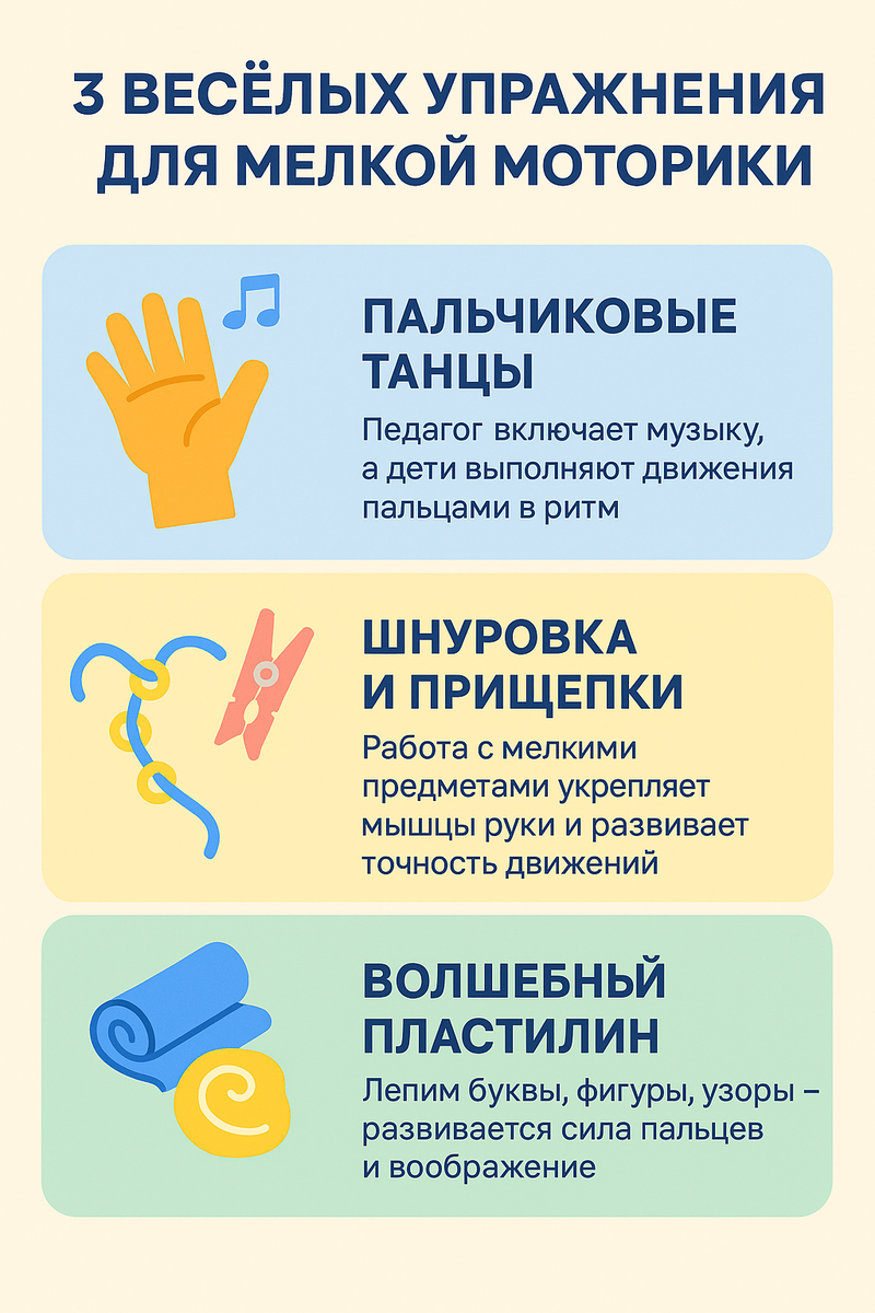 Перед школой важно не только выучить буквы и цифры, но и подготовить руку к письму. Развитие мелкой моторики — это ключ к аккуратному почерку и концентрации внимания. Почему мелкая моторика так важна: – связана с развитием речи и памяти; – тренирует внимание и усидчивость; – помогает ребёнку чувствовать уверенность при письме. 3 весёлых упражнения для мелкой моторики: «Пальчиковые танцы» Педагог включает музыку, а дети выполняют движения пальцами в ритм — это весело и тренирует координацию. «Шнуровка и прищепки» Работа с мелкими предметами укрепляет мышцы руки и развивает точность движений. «Волшебный пластилин» Лепим буквы, фигуры, узоры — одновременно развивается сила пальцев и воображение. Почему онлайн-формат помогает: Педагог показывает упражнения в реальном времени, ребёнок повторяет. Всё превращается в игру с элементами творчества. Вывод: сильная рука — это уверенное письмо. А весёлые упражнения делают подготовку к школе радостной. Хотите, чтобы ребёнку было легко писат