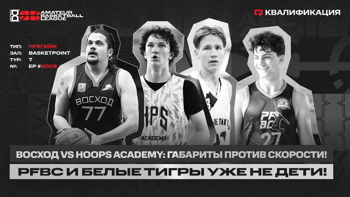 ПРЕГЕЙМ - BASKETPOINT - КВАЛИФИКАЦИЯ - 7 тур (2005 выпуск) 🍖Восход vs Hoops Academy: габариты против скорости 🍆PFBC и Белые Тигры уже не дети! 20:00 📱https://vkvideo.ru/video-154666590_456249748 1️⃣@ABL Moscow