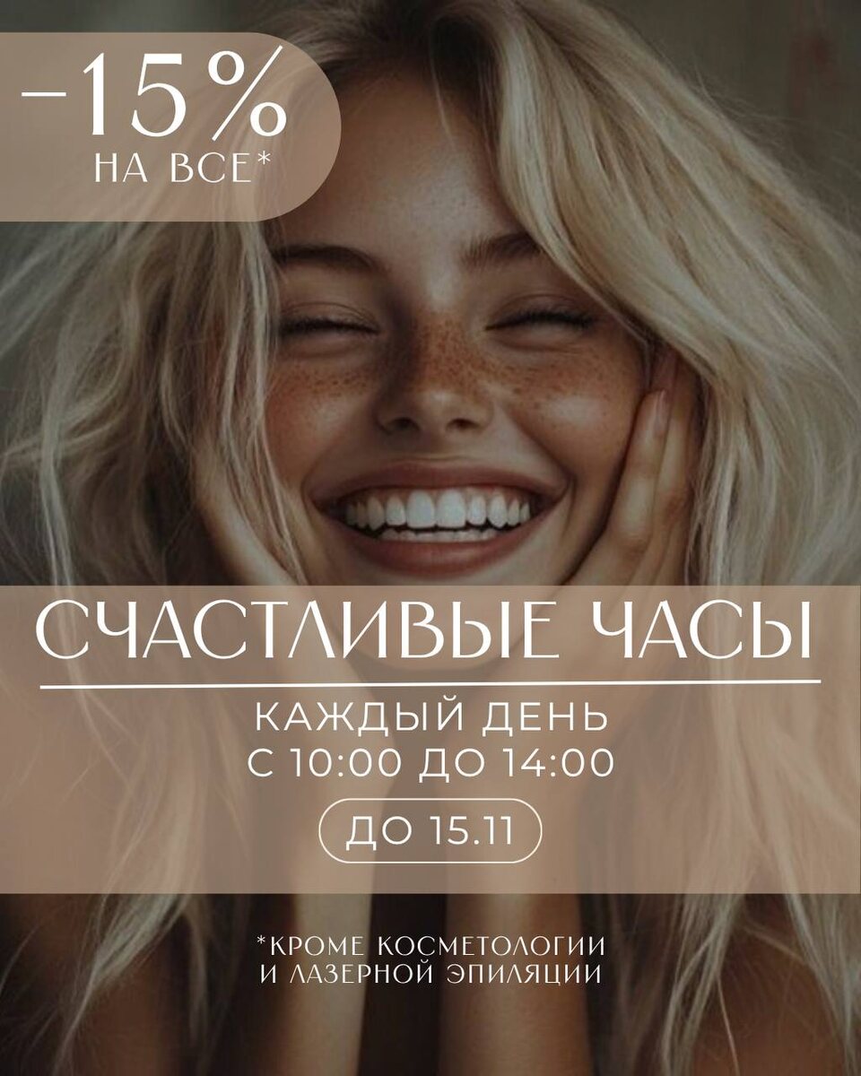✨ Счастливые часы в салоне Кайрос! ✨ Каждый день с 10:00 до 14:00 — скидка 15% на всё! 💇♀️💅💆♂️ (Кроме косметологии и лазерной эпиляции) ⏳ Успейте порадовать себя — акция действует до 15 ноября включительно! А ещё у нас действуют приятные предложения для новых гостей 🎁 • 1000₽ на любую СПА-программу • 500₽ на любую процедуру от 3000₽ • При коррекции бровей — СПА для бровей в подарок Записаться⤵️ https://dikidi.ru/kairosparnas 📍Ждём вас в салоне Кайрос по адресу: Санкт-Петербург, Парнас, Валерия Гаврилина, 15 - красота начинается здесь! 💖
