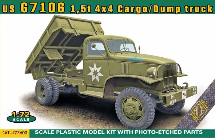 АСЕ из Киева показала боксарт своей модели американского армейского самосвала на шасси "Шевроле" в масштабе 1/72: US G7106 1,5t 4x4 Cargo/Dump truck (каталожный номер 72600)