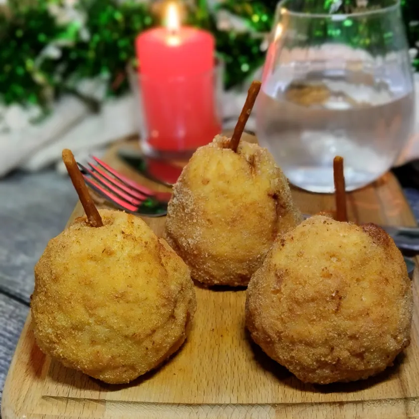 - Диетический вариант: Вместо жарки во фритюре можно запечь «груши» в духовке на противне, смазав их маслом.