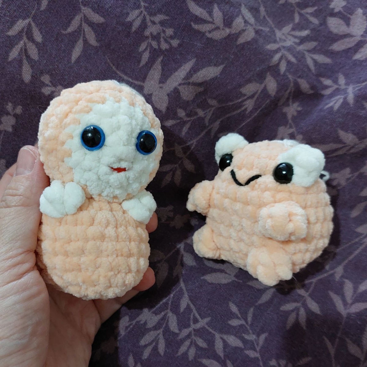 Попробовала связать неваляшку из плюшевой пряжи. И лягушку необычного цвета.