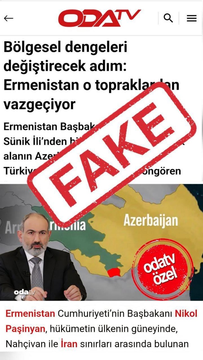 В последние дни ряд международных и местных СМИ, а также социальные сети распространили ложную информацию о том, что премьер-министр Армении Никол Пашинян объявил о передаче части территории Сюникской области Азербайджану и создании специальной пограничной зоны для Турции. Как сообщает Арменпресс, пресс-секретарь премьер-министра Республики Армения Назели Багдасарян официально заявила на своей странице в Facebook, что указанная публикация является дезинформацией, не имеет под собой никакой фактической и правовой основы и является частью гибридной войны, развязанной против Республики Армения. Багдасарян призвала граждан, СМИ и аналитические платформы воздерживаться от распространения подобных дезинформационных материалов, проверять достоверность информации и руководствоваться исключительно официальными сообщениями.