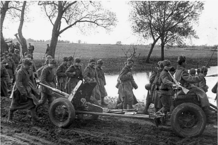 В десять вечера всех подняли, запрягли лошадей и приготовились к ночному маршу. Комбат, выслушав доклады о готовности всех подразделений, не стал дожидаться контрольного времени, а отдал приказ начать движение. Хотя мы и находились в глубоком тылу, но колонну сформировали по всем правилам. В боевое охранение ушёл первый взвод, сразу за ним моё орудие. Потом три роты стрелков, без двух взводов, пульрота, миномётчики, тылы батальона, и в арьергарде взвод махры и вторая наша сорокапятка с "обозом". Боковое охранение выставлять не стали, видимо, чтобы не потерять в темноте. Где-то неподалёку прогревали моторы трактора первого дивизиона гаубичного полка, но ждать их не стали, полк был на мехтяге, да и маршрут у них скорее всего другой. Наш же батальон шёл на соединение со своим полком, чтобы одной колонной двигаться дальше.