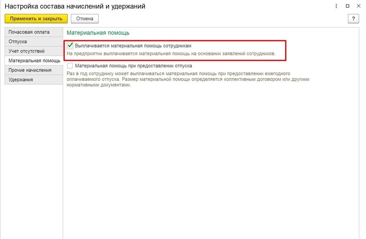 Материальная помощь к отпуску выплачивается работникам, как правило, по условиям коллективного или трудового договора, которыми определяется и срок ее выплаты. Размер материальной помощи может зависеть, например, от оклада работника, должности, стажа. В программе реализован механизм начисления материальной помощи. Для начисления материальной помощи в программе 1С ЗУП необходимо установить флажок в настройках расчета зарплаты Выплачивается материальная помощь сотрудникам. После установки флажка в список начислений добавятся 3 вида начислений. Материальная помощь при рождении ребенка согласно пп. 3, п. 1, ст. 422 НК РФ не подлежат обложению страховыми взносами суммы, не более 50000 руб. на каждого ребенка в течение первого года после рождения. В настройках начисления указывается код дохода НДФЛ 2762, вид дохода по страховым взносам Материальная помощь при рождении ребенка, облагаемая страховыми взносами частично. Материальная помощь, не облагаемая налогом – это материальная помощь, полно
