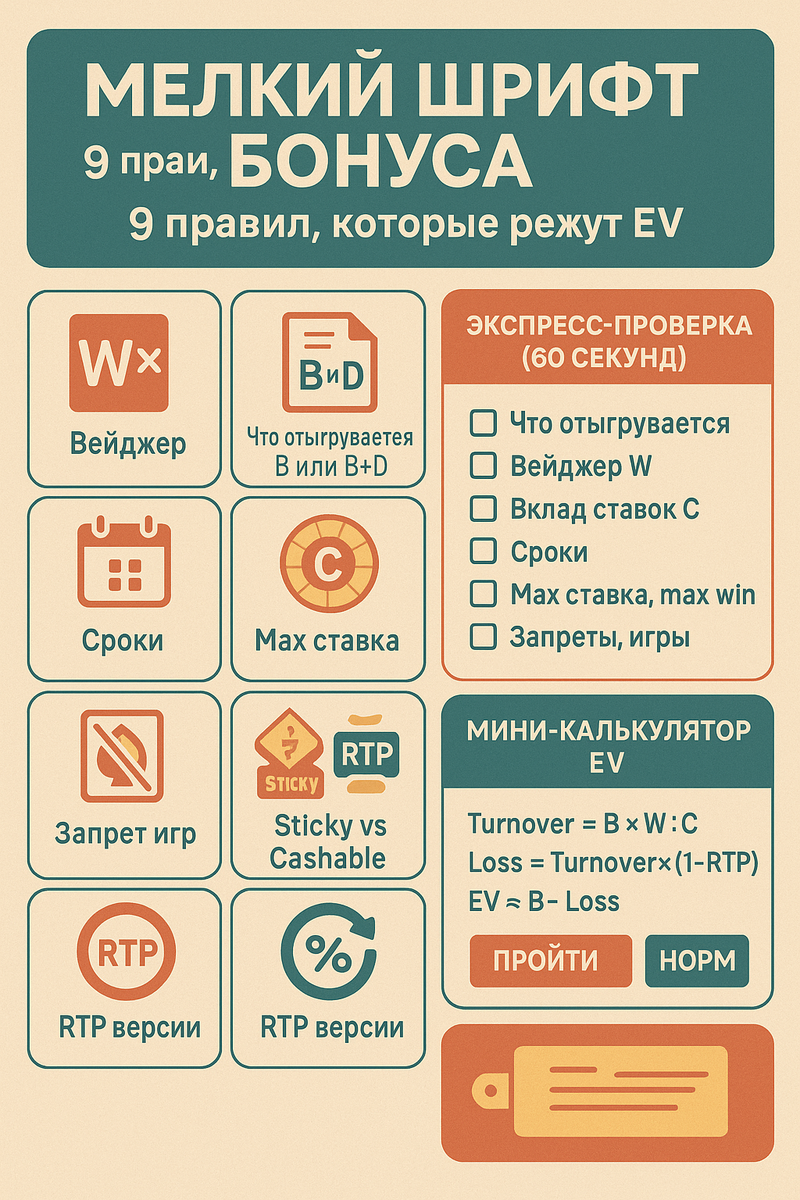 Turnover=200 000, Loss≈4 000 → EV ≈ +1 000 ₽ (если без капов). - «Липкий» бонус: даже при расчёте в ноль помни — сам бонус не выводится, значит реальный EV ниже на величину B.