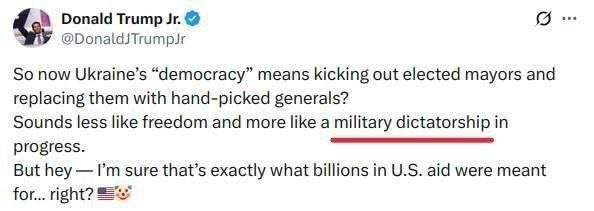 «Значит, теперь украинская «демократия» — это увольнять избранных мэров и заменять их назначенными генералами? Похоже не на свободу, а на военную диктатуру в процессе становления. Ну да, уверен, именно на это и шли миллиарды долларов американской помощи… верно?», - подытожил Трамп-младший. Напомним, Владимир Зеленский подписал указ о введении в Одессе военной администрации, которую теперь возглавляет бывший сотрудник СБУ Сергей Лысак. Ге