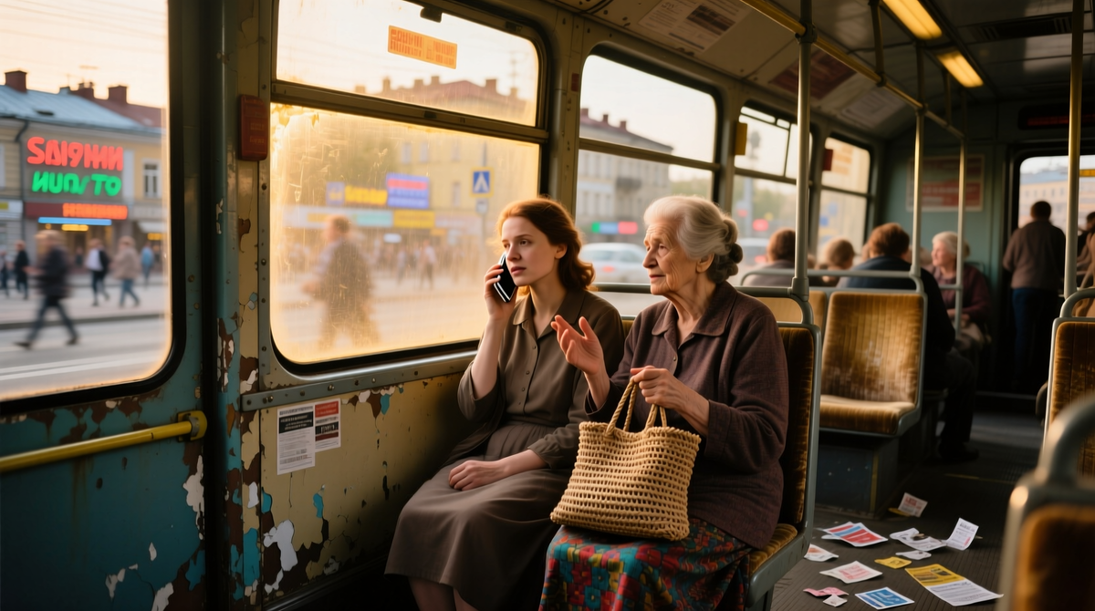 Внутри — духота, запах лука, пота и дешёвого парфюма. Кто-то чавкал, кто-то громко разговаривал по телефону, а она — просто сидела. Сжавшись.