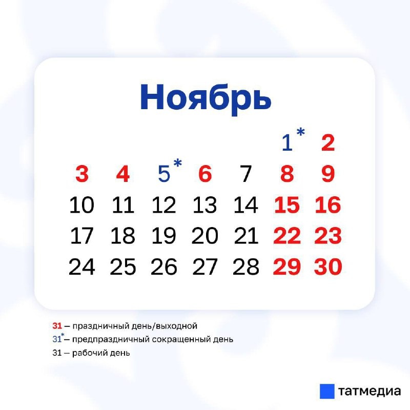 В ответ на пост 📆🐆В ноябре жителей Татарстана ждет сокращенная рабочая неделя 2, 3, 4, 6, 8 и 9 ноября являются выходными днями. Продолжительность рабочих дней 1 ноября и 5 ноября сокращается на один час – согласно части 1 статьи 95 Трудового кодекса РФ. @tatmediaofficial | Все каналы Татмедиа ™️ Время читать Татмедиа в MAX - подпишитесь.