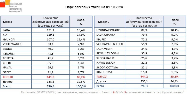 Парк автомобилей такси с действующими разрешениями на 1 октября составлял 799,4 тысяч автомобилей, подсчитали в агентстве НАПИ. 16,4% парка - автомобили производства ВАЗа, 14,9% - Kia, 13,4% - Hyundai. 10,4% парка таксомоторов - автомобили Hyundai Solaris, 10,4% - Лада Гранта, 9% - Kia Rio. Среди автомобилей 2022-2025 г/в в парке преобладают автомобили Лада, Chery и Haval. 9,9% и первая позиция среди автомобилей не старше трёх лет - снова за Грантой. #autopotok_statistics Ваш таксопарк: «Высокий спрос» 🚕 89697774262 📲 Комиссия от 1% 💰 (Подключаем ко всем фирмам такси и доставки) 🚗📦 #такси #водитель #курьер