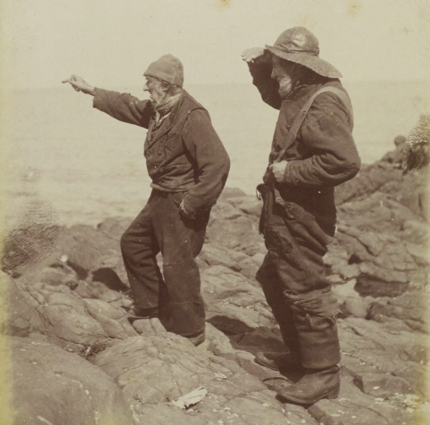 Двое стариков в промасленной насквозь одежде замерли на каменистом берегу. Один, в шерстяной шапке, натянутой почти до бровей, рукой указывает куда то в серую дымку залива. Второй, в кожаной шляпе с непослушными полями, приставил ладонь козырьком ко лбу, всматриваясь в указанном направлении.