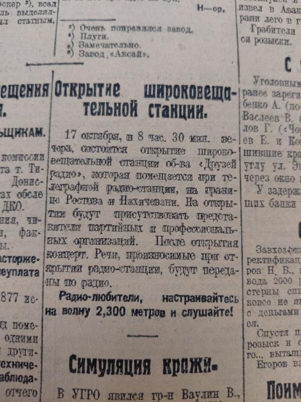 фото: газета "Молот" от 17 октября 2025 года / газета "Молот" / ВК Первая радиостанция мощностью 1,2 киловатта охватывала сигналом радиус до 300 километров. Аппаратуру изготовила Нижегородская радиолаборатория, а передатчик принадлежал Обществу «Друзей радио». Первые передачи представляли собой радиогазеты - дикторы зачитывали наиболее интересные статьи из печати. Вскоре появились и концерты - в эфире зазвучал небольшой симфонический оркестр. - Появление радио было подобно чуду, - вспоминал один из первых слушателей В. Буриков. 7 ноября 1925 года на перекрёстке улицы Энгельса и проспекта Семашко стояла тишина: люди слушали «Кармен» из Большого театра через шум и треск эфира. Радио покорило нас сразу. Уже через год донская радиосеть стала одной из самых мощных в стране. В 1926 году крайком ВКП(б) обратился в Москву с предложением построить более сильную станцию, и вскоре в Ростове появился передатчик на 4 киловатта - четвёртый по мощности в СССР. В 1932 году она была названа в честь В.