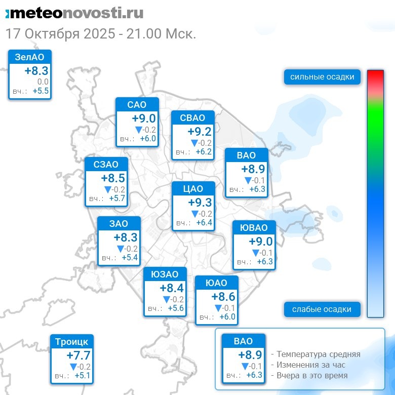 В 21:00 в Москве было от +7.5°C до +9.4°C, средняя температура +8.7°C #погода #Москва #осень #температура #17октября #пятница Перейти на сайт Прогноз погоды на 14 дней