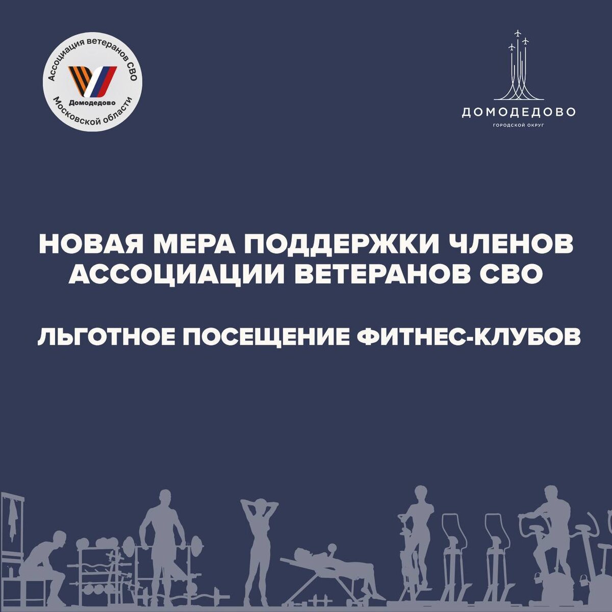💪Внедрили новую меру поддержки для членов Ассоциации ветеранов СВО – льготное посещение фитнес-клубов. С инициативой выступили на прошедшем в конце августа Координационном совете и получили поддержку от представителей частных фитнес-клубов округа. За это время проработали вопрос, и теперь льгота официально действует. ✅ Как воспользоваться льготой: - прийти в местное отделение Ассоциации ветеранов СВО (ул. Советская, д. 8) и получить направление на диспансеризацию - пройти диспансеризацию для оценки состояния здоровья - получить справку о членстве в Ассоциации ветеранов СВО (Домодедовское отделение) - с результатами диспансеризации и справкой обратиться в рекомендованные Ассоциацией спортивные центры ❗️Обратите внимание, что льгота действует не во всех спортивных клубах округа – с актуальным перечнем можно ознакомиться в Ассоциации ветеранов СВО (тел. +7 (925) 060-60-97; +7 (496) 792-42-52). Благодаря принятой льготе у ветеранов СВО теперь есть возможность поддерживать здоровье, во