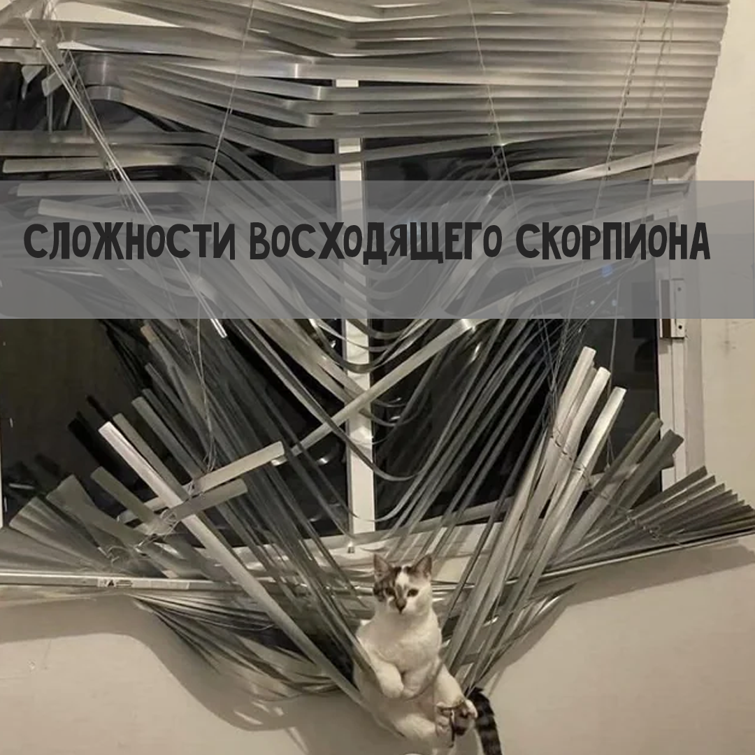 Чудесный белый кот удобно устроился на спутанных жалюзи, которые все еще держаться на окне, хоть и изуродованные. Кот — восходящий Скорпион, а жалюзи — сложности. Восходящий Скорпион как бы говорит: «Нет-нет, мне удобно, клянусь».