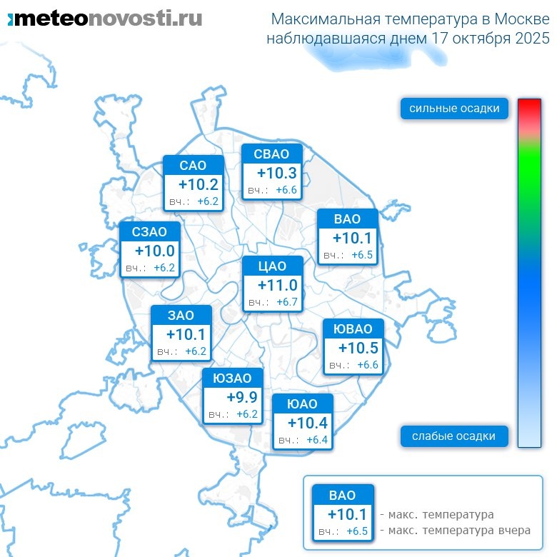 #за12часов #день Прошедший день 17 октября оказался на 4.2°C теплее вчерашнего. Максимальная температура днём в Москве оказалась на 2.4°C выше нормы, что в пределах обычных значений. Самая высокая температура +11.0°C была зафиксирована в 11 часов в центре города, а холоднее всего было на юго-западе: +7.7°C. Разница по максимальной температуре в разных частях столицы составила за день 3.3°C. Максимальные порывы ветра днём достигали 5 м/с. Атмосферное давление за день повысилось с 746 до 747 мм.рт.ст. На большей части территории города прошли небольшие осадки. Больше всего осадков выпало на западе города – 2.9 мм. Самый теплый день в Москве 17 октября был в 2019 году, когда максимальная температура составила +18.3°C, а холодный в 1976 году: -1.1°C. Перейти на сайт Прогноз погоды на 14 дней