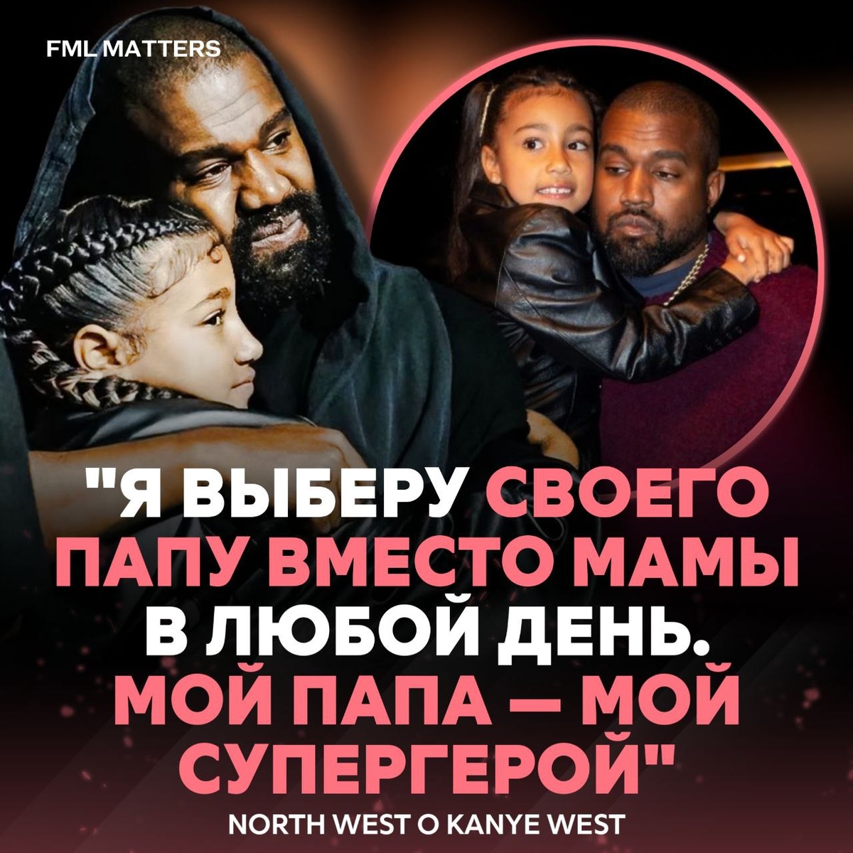 💕 ДОЧЬ KANYE WEST ПРИЗНАЛАСЬ, ЧТО БЛИЖЕ К ОТЦУ, А НЕ К МАТЕРИ! 12-летняя Норт откровенно рассказала о своих родителях и призналась, что чувствует особую связь с Йе, называя его своим примером и героем. Девочка рассказала, что именно с отцом ей комфортнее всего — он уделяет ей внимание, несмотря на плотный график: «Он всё делает сам — готовит для меня, заботится обо мне и следит, чтобы я была в безопасности. У нас нет нянь, поваров или телохранителей, только мы, и мне это нравится. Когда я жила с мамой, вокруг всегда были люди, которые всем занимались, а её почти не было дома. А мой папа — он и правда лучший отец, о котором только можно мечтать» Отец не только легенда музыки, но и лучший папа 🫶 💀 FML MATTERS