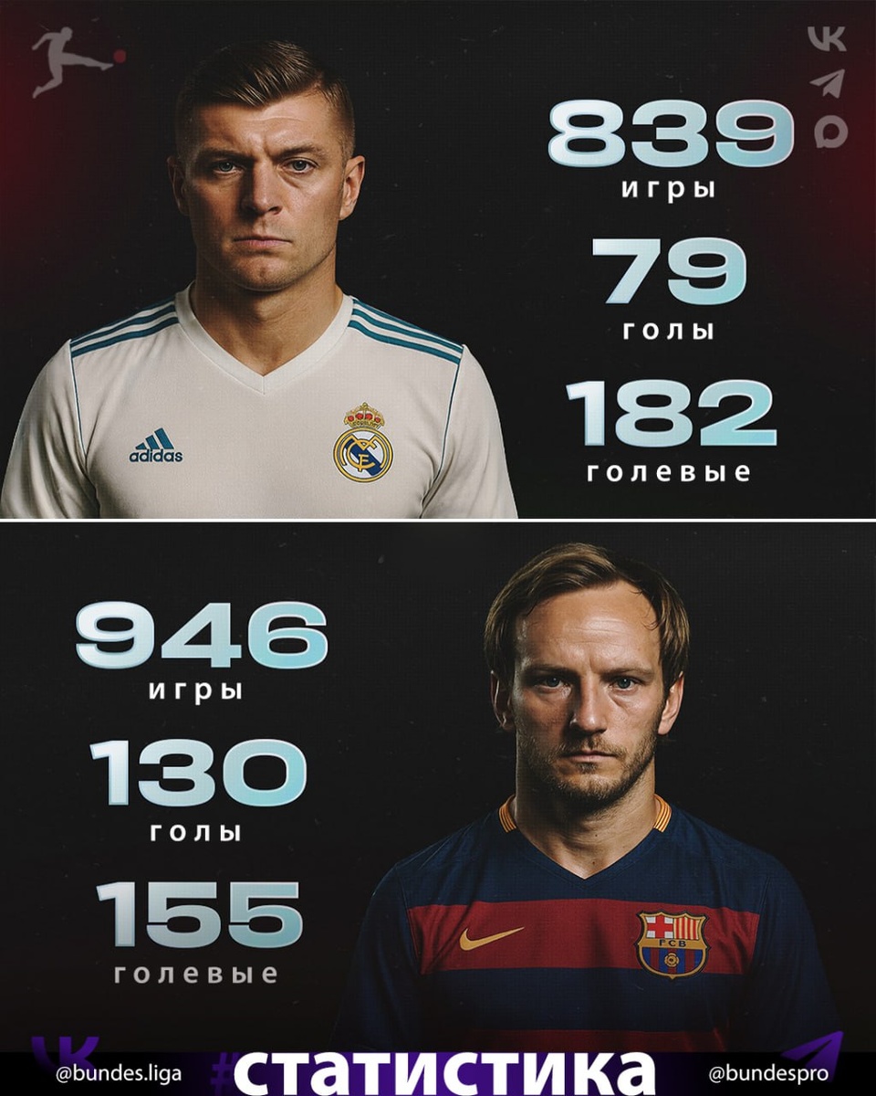 #Статистика 📊 Иван Ракитич 🆚 Тони Кроос 🇩🇪 Тони Кроос: 🏟 839 матчей ⚽️ 79 голов 🅰️ 182 передачи 🇭🇷 Иван Ракитич 🏟 946 матчей ⚽️ 130 голов 🅰️ 155 передач Достойные ребята закончили с футболом 👏