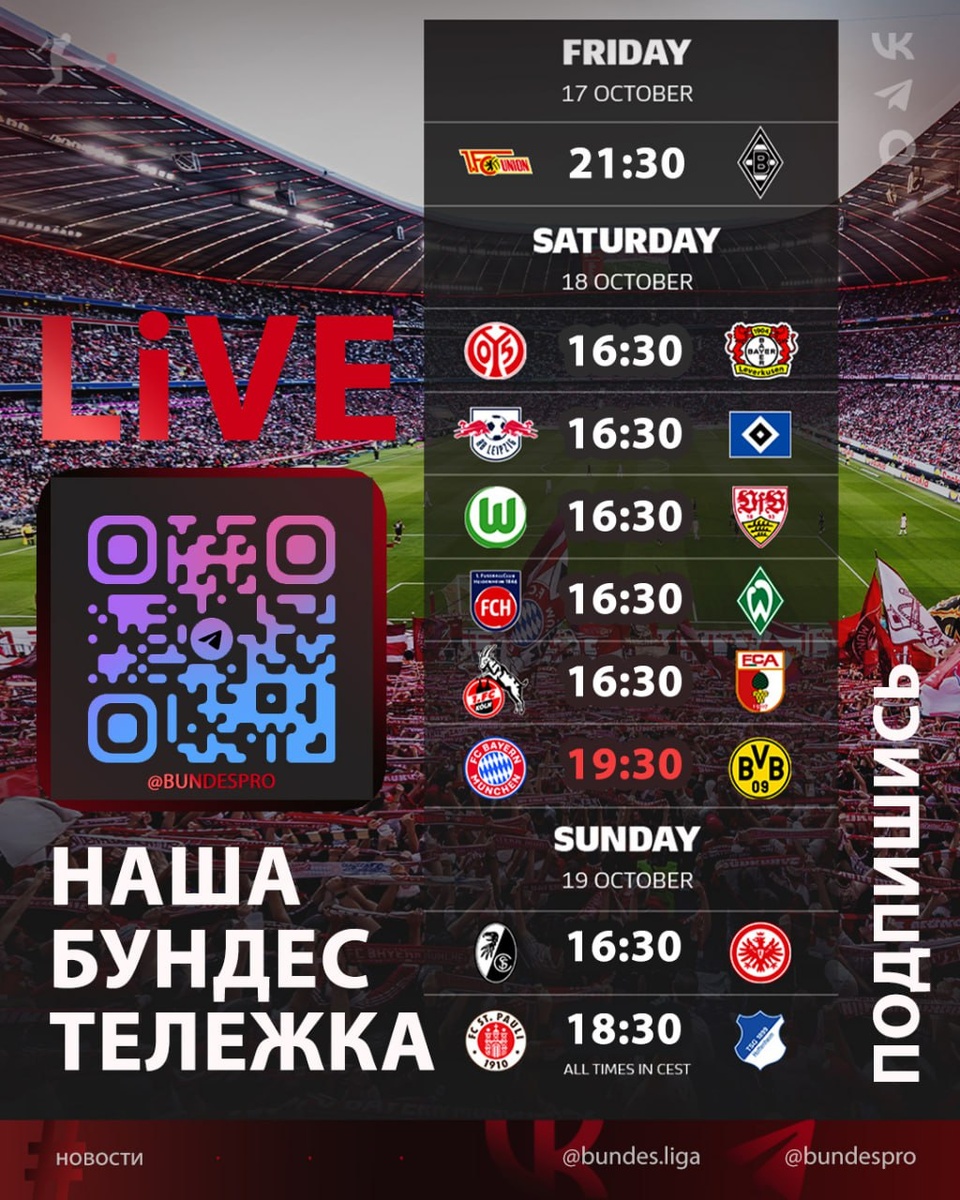 Крутейшие битвы на этих выходных! 🔥🔥🔥 Не пропустишь главного: результаты, обзоры, статистика, таблица и видео! ✅ 🚀 Расписание матчей 7-го тура Бундеслиги сезона 2025–2026: 17 октября 2025 года 21:30 «Унион» — «Боруссия М» 18 октября 2025 года 16:30 «Хайденхайм» — «Вердер» 16:30 «Майнц» — «Байер» 16:30 «Вольфсбург» — «Штутгарт» 16:30 «РБ Лейпциг» — «Гамбург» 16:30 «Кёльн» — «Аугсбург» 19:30 «Бавария» — «Боруссия Д» 🔥 19 октября 2025 года 16:30 «Фрайбург» — «Айнтрахт Ф» 18:30 «Санкт-Паули» — «Хоффенхайм» Следи за лучшим футболом планеты в нашем ВК и ТГ 🔥 🏆 Это Бундеслига, брат! #Бундеслига