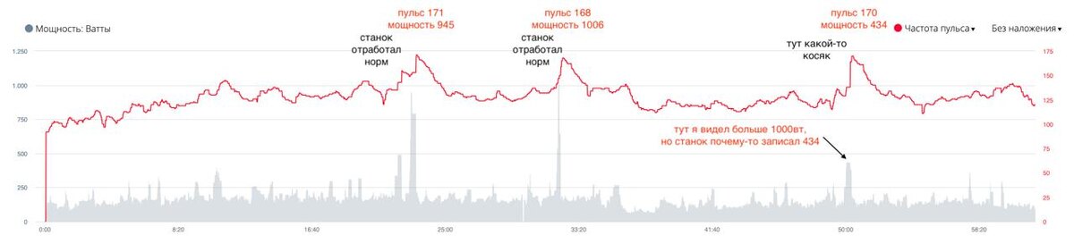 На третьем спринте я на экране видел больше 1тыс ватт, но в итоговой сводке записалось 434вт. Странно. Первые 2 соответствуют, а вот 3й нет. Что за глюк такой я не понял.