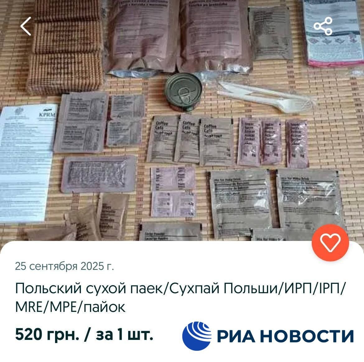 Украинцы распродают на сайте объявлений сухпайки из военной помощи от Польши, в состав таких боевых рационов питания входит паэлья с курицей
