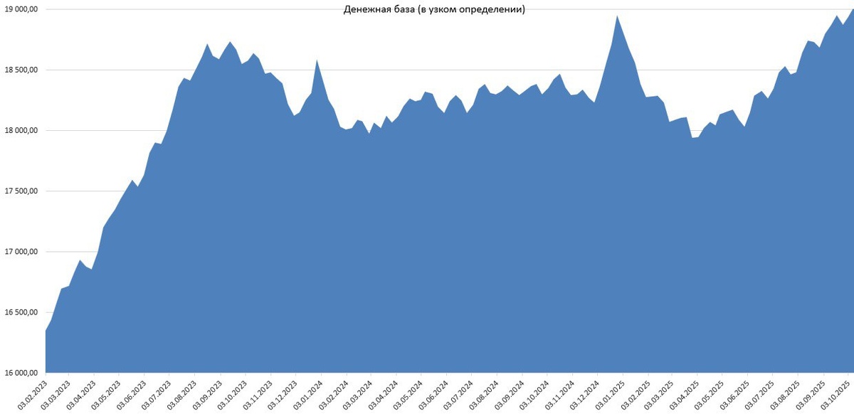 ХОРОШАЯ НОВОСТЬ Ускорение роста узкой базы Скачал цифры с сайта ЦБ РФ Построил график 10 10 25г = 19 019,3 трлн (исторический max) +0,43% за неделю, 3 10 2025г = 18938,6 трлн +0,33% за неделю Ускорение денежной массы - позитив и для валюты, и для фонды. Но ставка ЦБ, в этом случае, будет снижаться медленно. Напоминаю, узкая денежная база — это наличные деньги плюс обязательные резервы кредитных организаций в центральном банке. Важнее рост М1. Но М1 ЦБ РФ публикует ежемесячно, а узкая база еженедельно. Обратите внимание на график, чем 2023г (рост фонды) отличается от 2024г (коррекция)