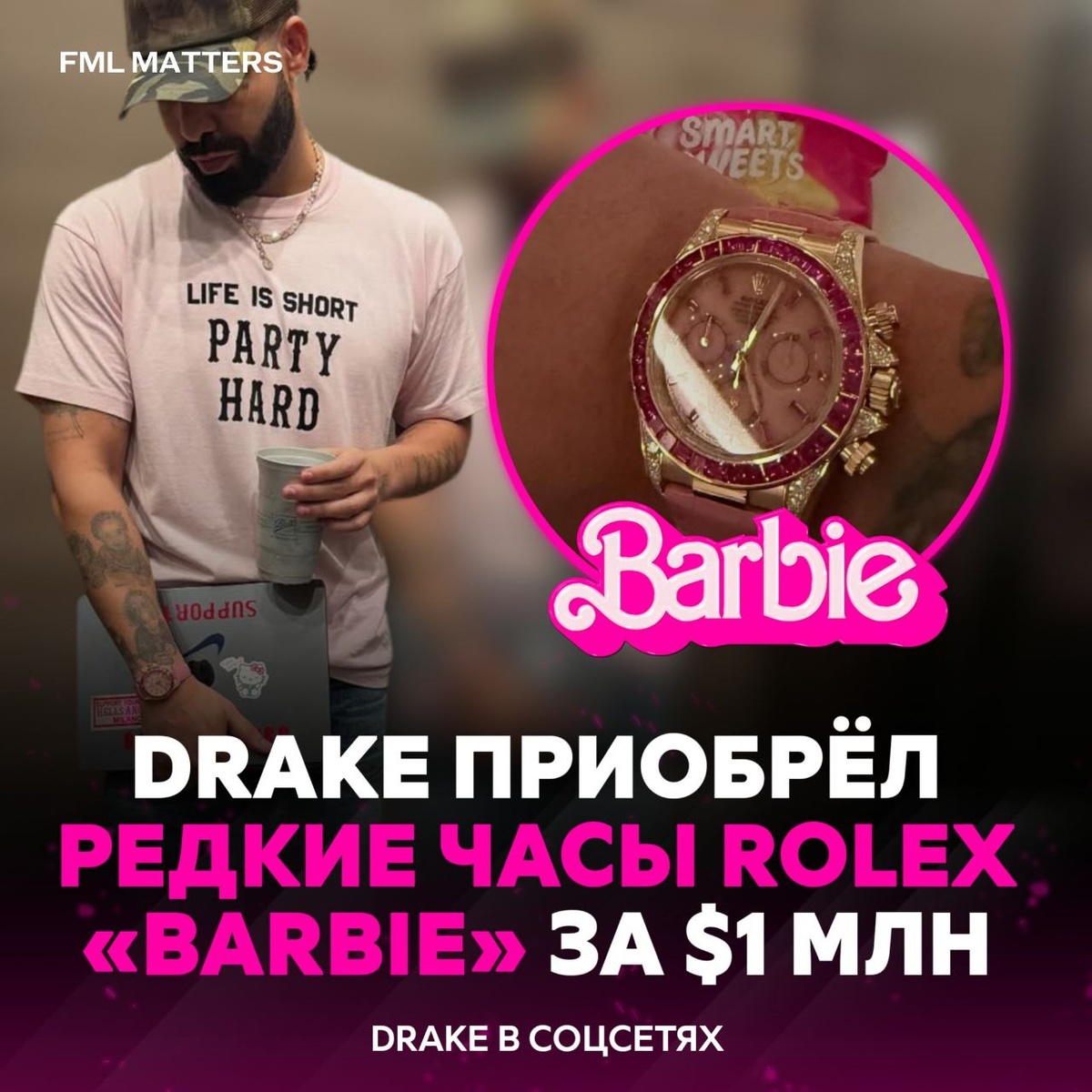 ⚡️ DRAKE ПРИОБРЁЛ РЕДКИЕ ЧАСЫ ROLEX «BARBIE» ЗА $1 МЛН! Дриззи показал свои уникальные часы Rolex Daytona «Barbie» с розовыми сапфирами. В мире их меньше десяти, и они стоят около миллиона долларов. Норм побрякушка? ❤️🔥 / 👎 💀 FML MATTERS