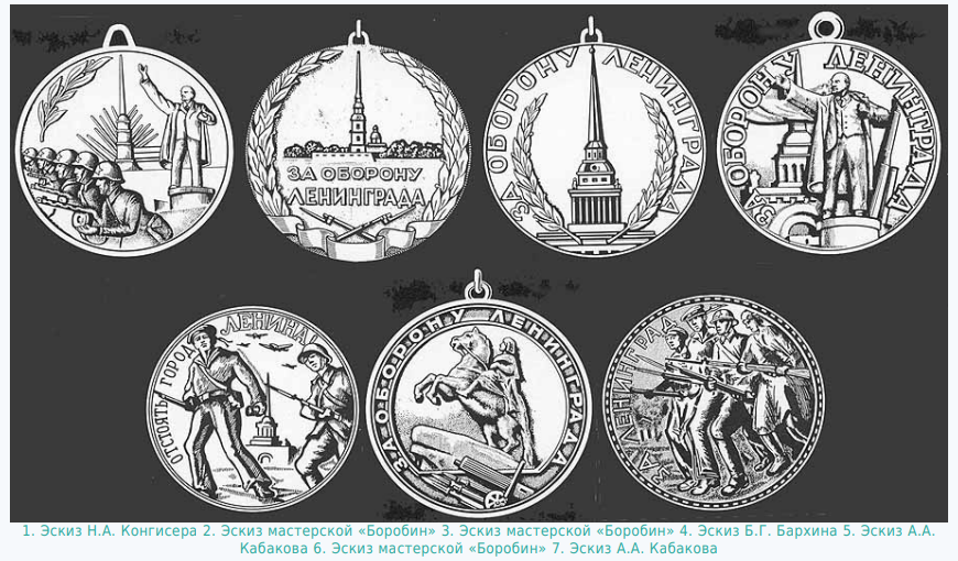 Осенью 1942 года Народный комиссариат обороны обратился в Президиум Верховного Совета СССР с ходатайством об учреждении медалей за оборону четырёх городов. Для медали «За оборону Ленинграда» было разработано восемь проектов. Эскизы представили художники Н.А. Конгисер, Б.Г. Бархин, А.А. Кабаков и бригада мастерской «Боробин».